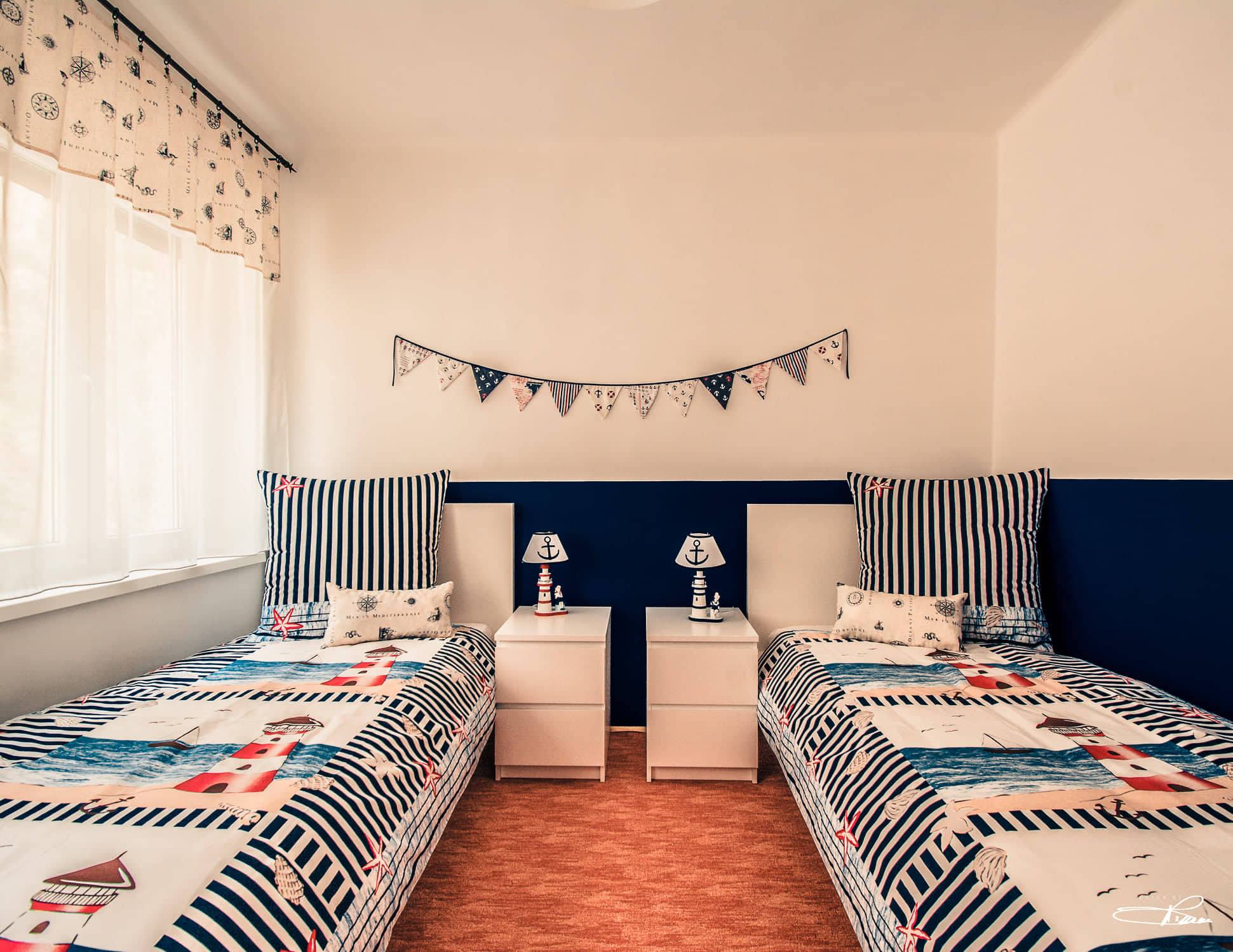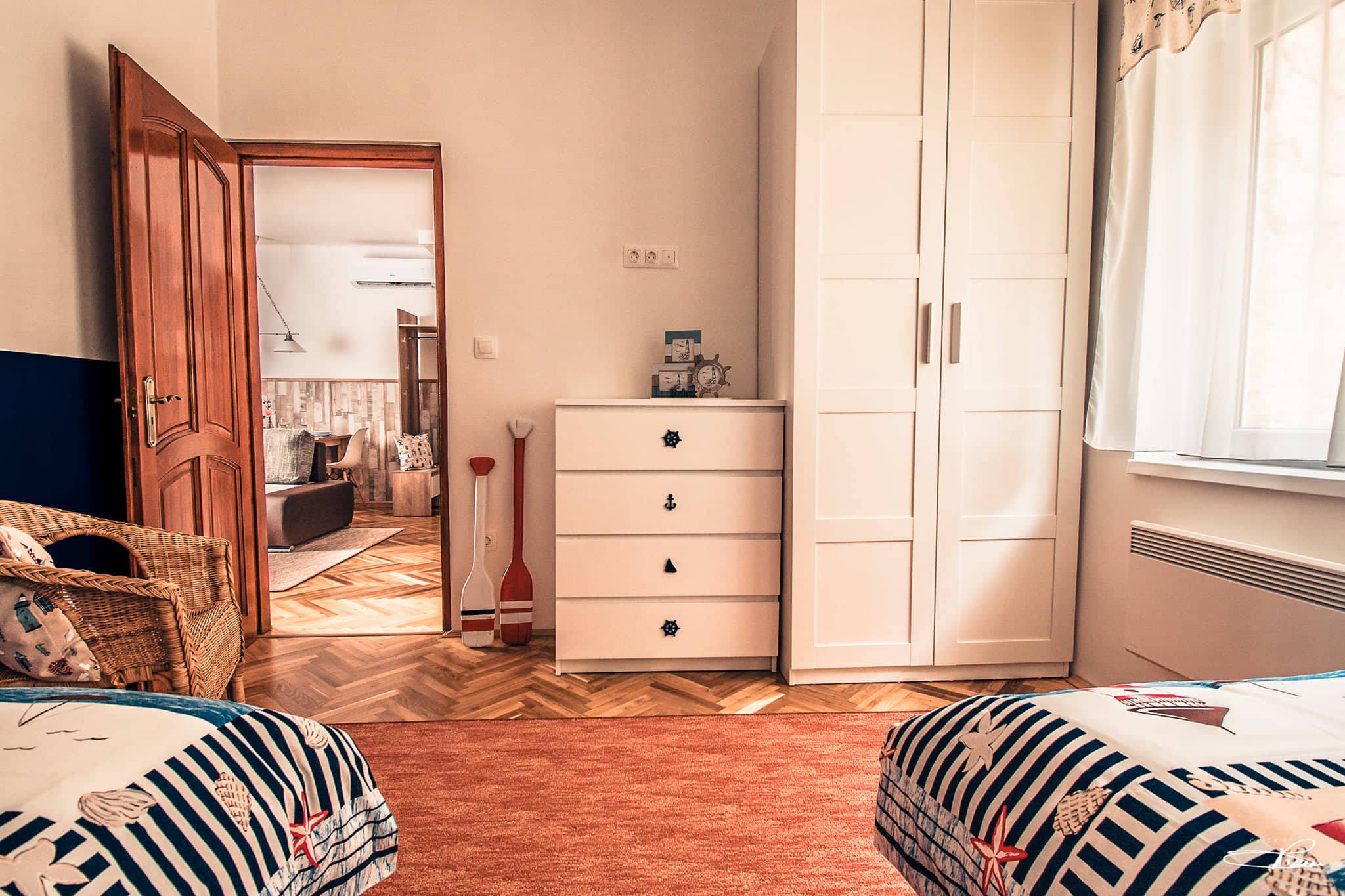 A lakásban két különálló hálószoba található az egyikben franciaágy a másikban két különálló ággyal. Az apartman központi része a nappali ahol az ebédlő is helyet kapott. A nyaralóban 2 síkképernyős TV található, egy nagyobb a nappaliban és egy kisebb a franciaágyas hálószobában. A jól felszerelt konyhában nagyméretű hűtő-fagyasztó szekrény, mikrohullámú sütő, indukciós főzőlap és mosogatógép is van. A zuhanyzós fürdőszobától külön helyiségben található a WC. Vendégeink részére ágyneműt és törölközőket biztosítunk. A megfelelő hőmérsékletet 3 hűtő-fűtő klíma biztosítja. Az udvarban lehetőség van grillezésre, kerékpárok zárható tárolására illetve autó parkolásra. Kerékpárokat biztosítunk vendégeink részére,illetve 2 darab sup használatára is van lehetőség igény esetén.